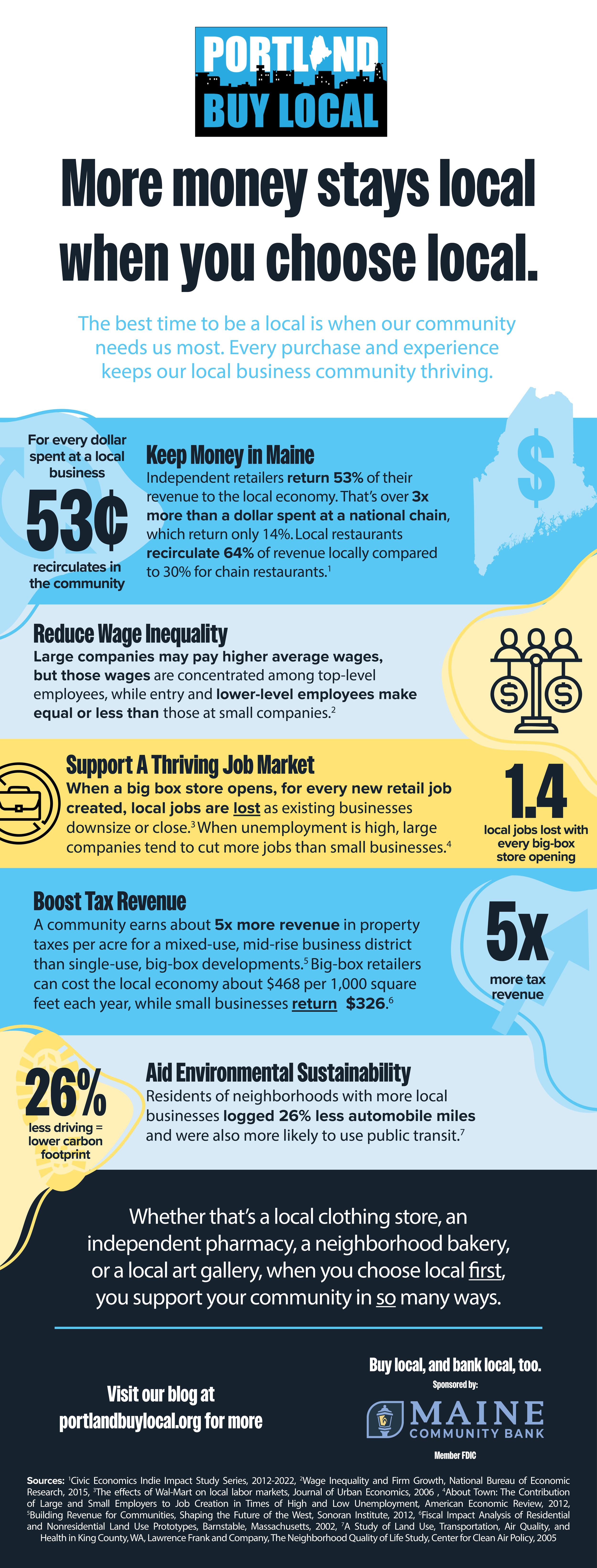 For every dollar spent at a local business, around 53 cents stays in the community. That’s 3x more than a dollar spent at a big chain store.